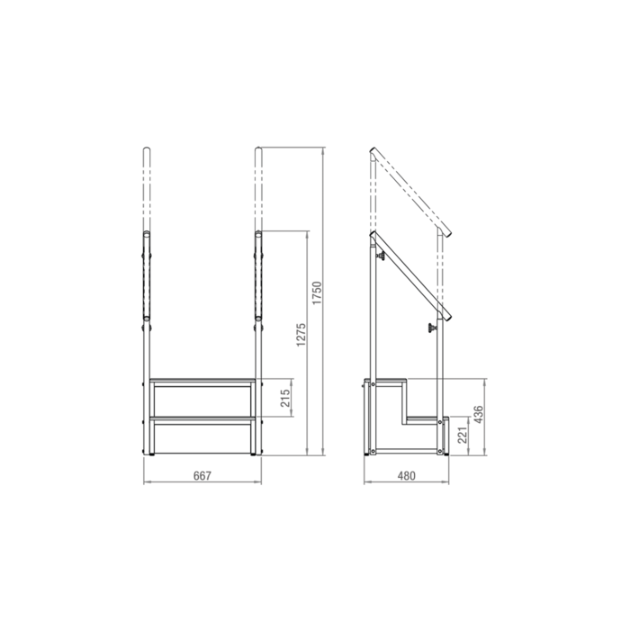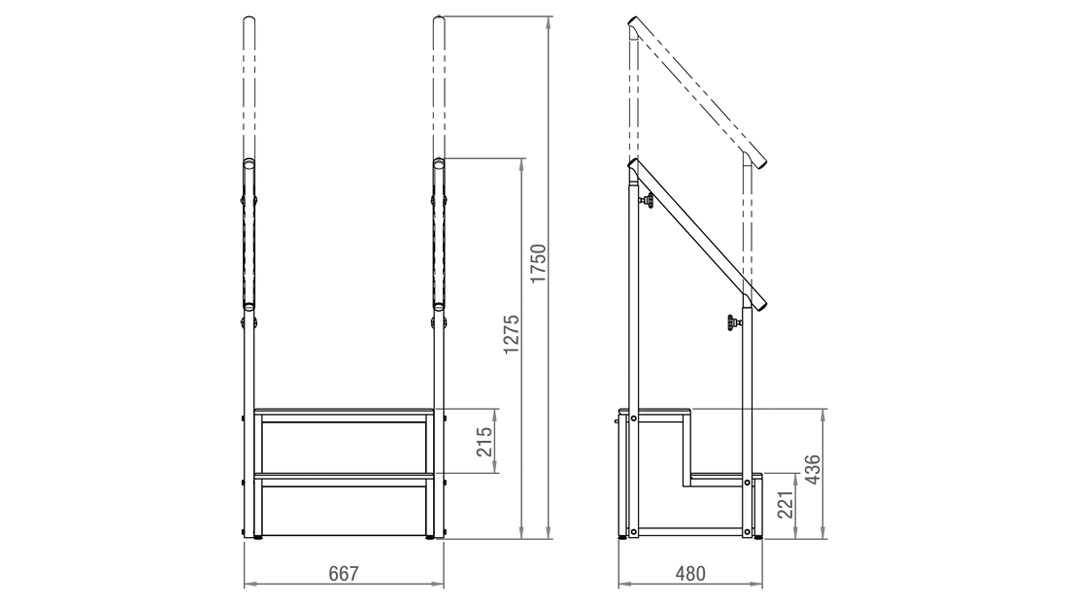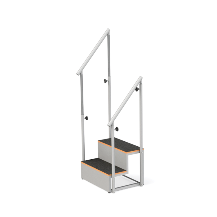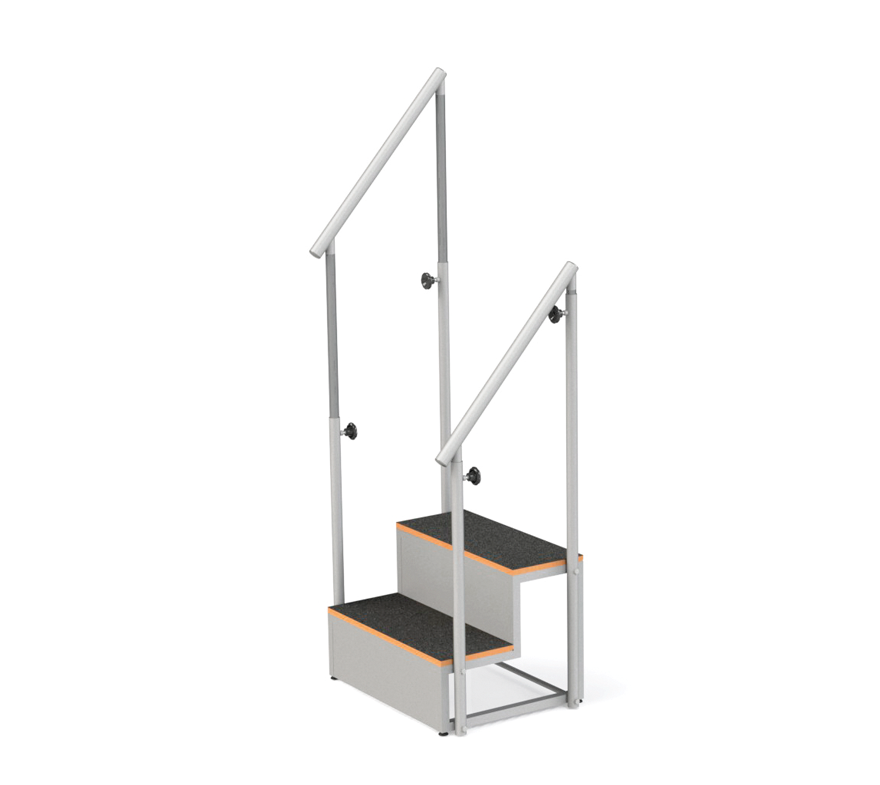 Estrutura em aço com acabamento epoxy e degraus em MDF revestidos a tela antiderrapante.
