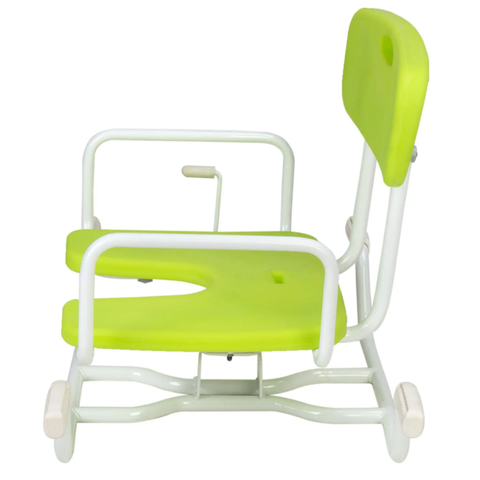 O assento e encosto são feitos em polietileno termoplastificado verde. Esta cadeira para banheira possui assento com abertura na parte da frente em forma de ferradura, para facilitar a higiene íntima.
