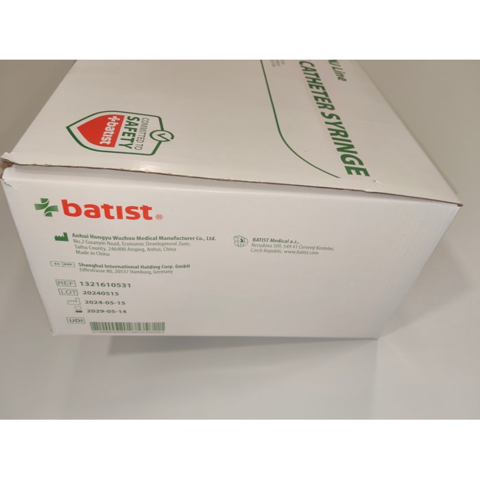 Seringa atóxica e apirógena em material plástico adequado para uso médico composto de: • cilindro em polipropileno medical transparente com escala graduada de 2 ml com intervalos de 10 ml de cor preto • cone cateter central • haste do cilindro em polipropileno medical • pistão livre de látex para uma fluência controlada. O lubrificante utilizado para facilitar o deslizamento do pistão é de silicone atóxico para uso médico. Utilização prevista: Seringa para infusões, destinada à irrigaçãoda bexiga, ao uso parenteral e à colheita, estéril, em 3 peças, quimicamente estável